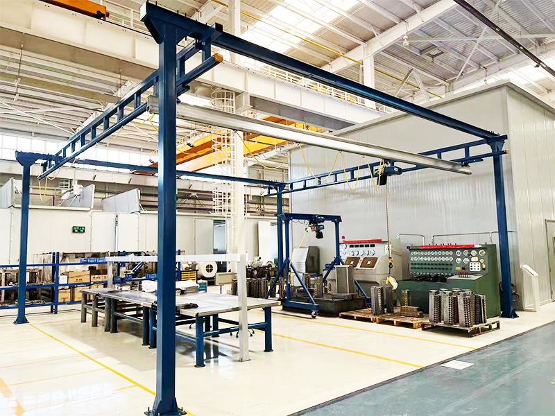 孚爾特組合式自立起重機,型號: MLCSLX - FS -250-7(2)-28-3, MLCSL - FS -500-9.7(2)-23.5-3。 X - Y 方向均為手動運行,升降采用雙速環(huán)鏈電動葫蘆配合。